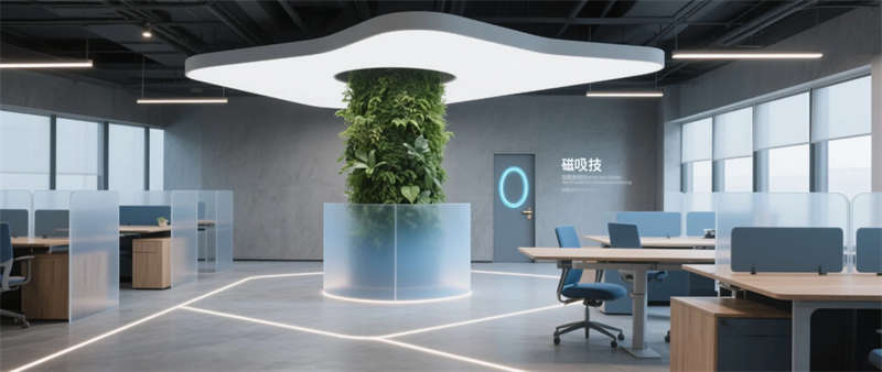 本项目以“未来生态办公”为核心理念,打造1200㎡科技与自然交融的创新型办公空间。设计采用哑光太空灰为主基调,通过雾霾蓝企业色原木纹理的碰撞,在冷峻科技感中注入人文温度。空间以微水泥地面为基底,贯穿透光亚克力阳极氧化铝材质,配合隐藏式线性灯带的流动光影,构建出具有呼吸感的数字美学场域。