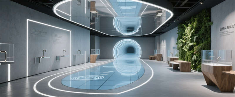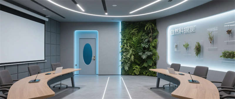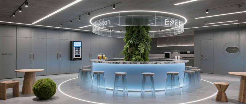 各区域通过四大统一性语言紧密串联:雾霾蓝椭圆金属门把手贯穿全空间,再生材料家具呼应可持续发展理念,声学墙面嵌入本地植物标本强化生态属性,智能灯光系统则通过4000K色温线性灯带实现昼夜场景的无缝切换。特别设计的全息投影展厅智能阶梯会议室,通过LED交互地屏与AR悬浮展台,将品牌科技基因融入空间体验。