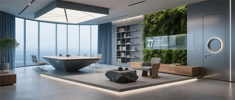 入口大厅以8米宽LED弧形屏呈现动态视觉冲击,悬浮曲面黑岩板前台与天花垂坠的3D打印树脂装置形成虚实对话;开放式办公区通过模块化磁吸工位与中央绿植柱,实现灵活协作与生态疗愈的平衡;总裁办公室270°全景落地窗搭配悬浮会议岛,几何切割天花与火山石茶台演绎力量与自然的共生哲学。
