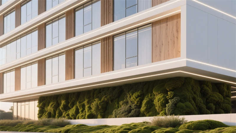 本案立足合肥科技创新城定位,以“自然渗透科技”为核心策略,打造7000㎡智慧办公综合体。外立面通过双层呼吸式幕墙与垂直木纹格栅交织,形成动态光影滤网,底部苔藓景观带同步净化PM2.5,实现建筑与巢湖生态区气候的有机对话。