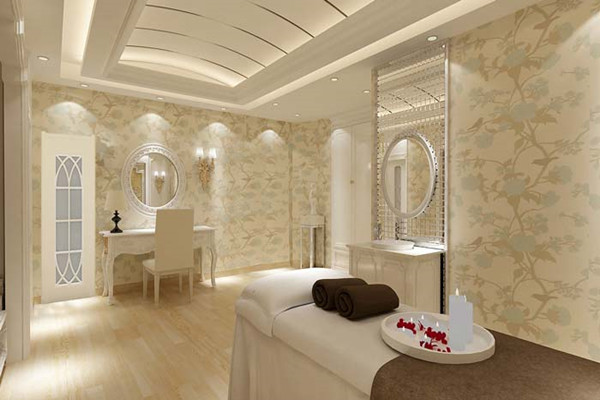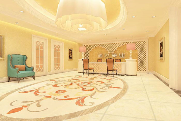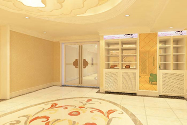 会所大堂采用近几年比较流行的欧式风格。以淡黄色为主色调,给人以温馨舒适之感;大厅灯具选用水晶灯池,简约奢华;墙面则辅以墙纸装饰,地面则选用色泽饱满、深色典雅的花岗石。整体突显欧式古典风格的宁静和谐。