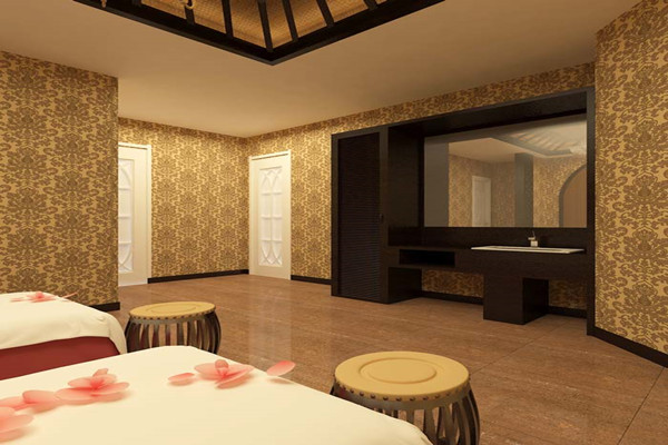 另外东南亚风格的SPA间则采用了较深的木色擦色做漆,并且做了东南亚风格的吊顶。