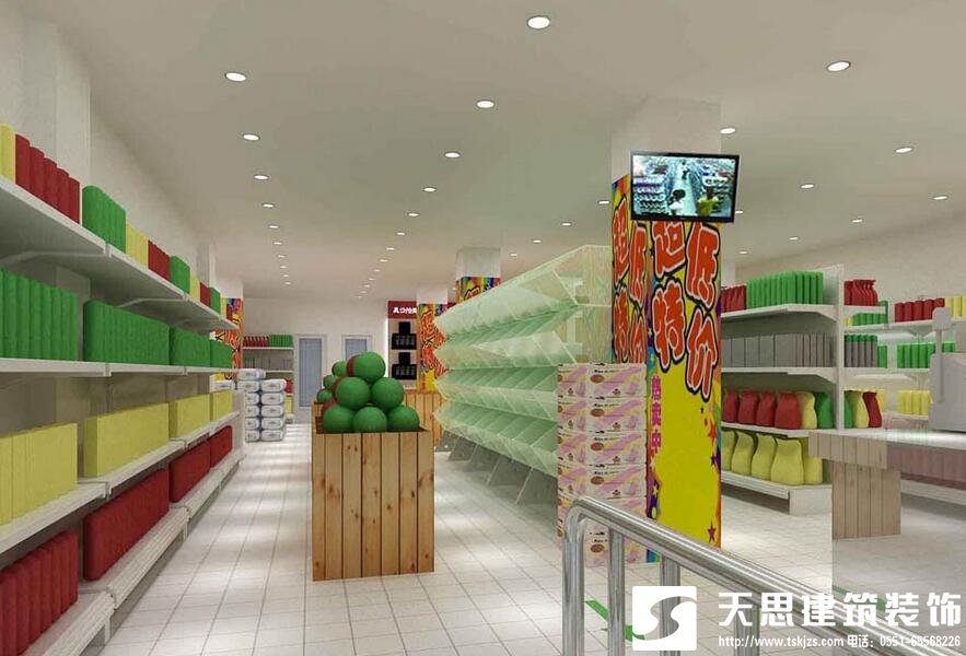 便利店对店铺层高的要求一般在3米以上,但由于所选择的店面多数处于底层,天花板下多数有下水管、电线管、消防管等管道,这时不要安装吊顶天棚将这些管道隔离,只要这些管道粉刷成纯白色,并将光源置于管道之下即可,这样既可以保证商店的空间,又可以节省费用。