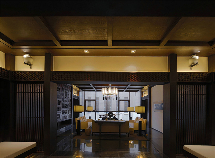 走入大堂,室内空间宽阔,天花鳞次栉比通向楼梯方向,墙面灰色石材雕刻,将桃花源记中的诗句映入客人眼帘,禅境古意扑面而来。镂空屏风隔墙的设计,让空间隔而不断,与具有传统韵味的家具和配饰相互交融,打断俗世的纷扰。柱子和天花上的装饰灯具,利用金属和木材两种截然不同的材料和质地,创造空间内在张力,透过锐利的金属、细腻的木质线条强调空间结构,精致笔挺的吊灯,令空间由内向外展现独特魅力。