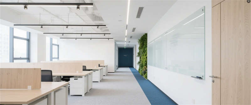 开放式办公区:北欧风工位搭配绿植墙,裸露天花轨道射灯兼顾实用与工业美感;