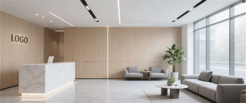 前台大厅:浅木色LOGO墙与大理石接待台奠定简约基调,线性灯光延伸视觉纵深;
