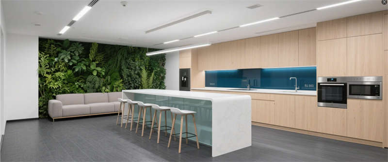 休闲茶水间:白色吧台与绿植墙营造松弛氛围,地胶材质耐磨易清洁。