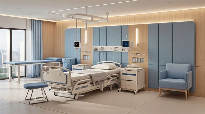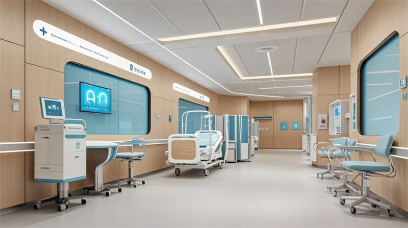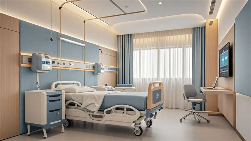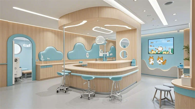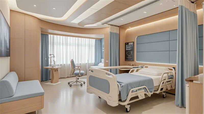 门诊大厅以8米挑高空间构建医疗门户形象,曲面导诊台与智能分诊系统形成高效服务枢纽,木纹格栅吊顶与绿植景观墙弱化传统医院的冰冷感。儿科诊区创新运用马卡龙色系与云朵软包墙面,互动投影游戏区搭配动物主题诊疗设备,构建儿童友好型医疗环境。VIP病房采用全景落地窗与智能护理系统,可变形家具满足陪护与康复双重需求,展现高端医疗的温度感。