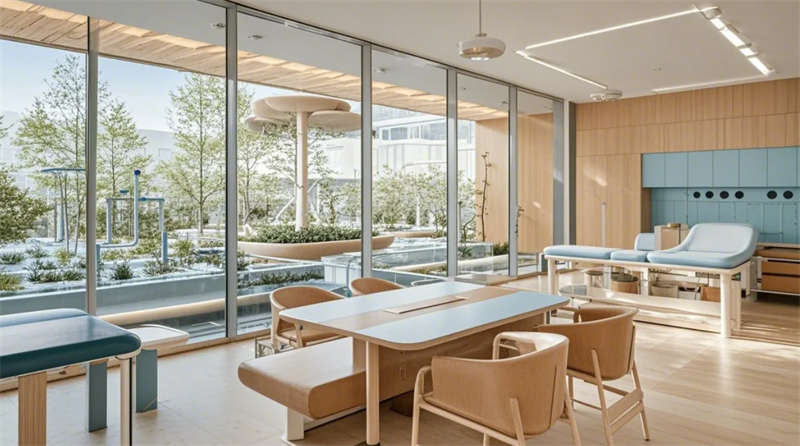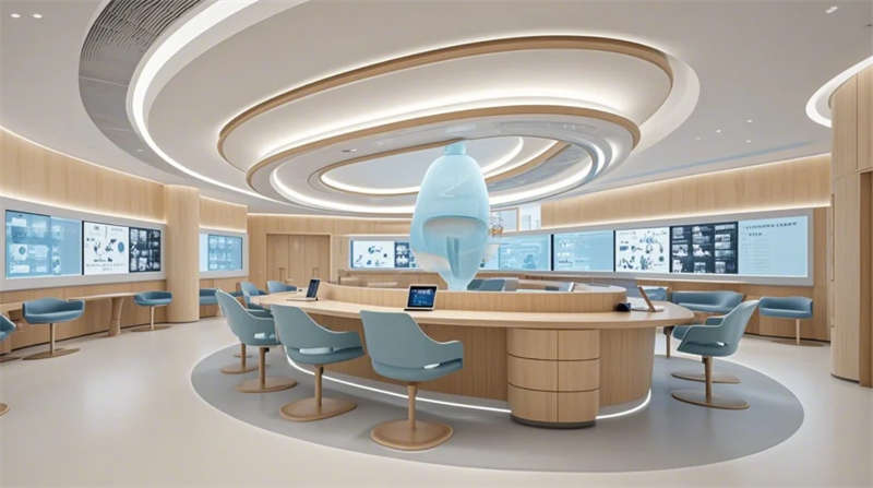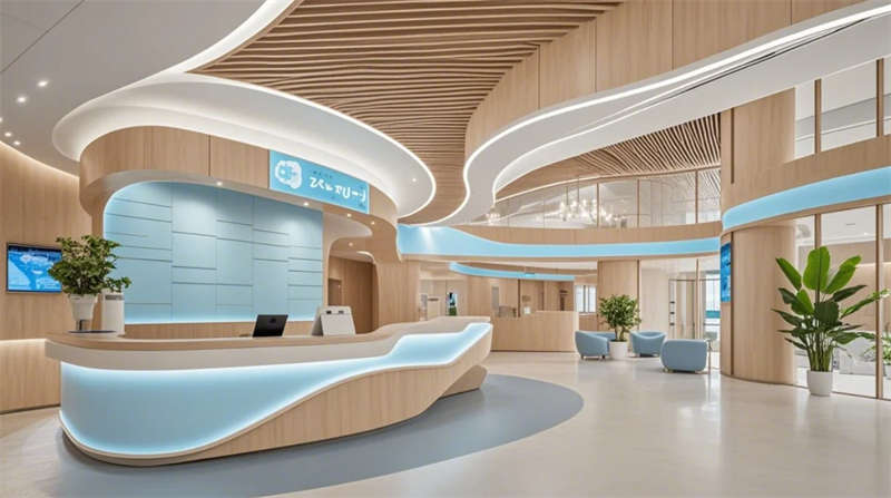 空间设计深度融入院感防控要求,全区域采用环氧树脂自流平地胶与抗倍特抗菌板材,医技区双通道设计实现洁污分流。智能系统贯穿全场景:手术等候区的动态光环境调节、康复花园的感应式照明、急诊通道的电子玻璃隔断,彰显科技医疗时代特征。设计团队特别注重心理疗愈,270度观景等候区、水景冥想花园、减压艺术装置等创新节点,重构了传统医疗空间体验,塑造兼具专业信赖感与情感温度的新型现代医院范本。